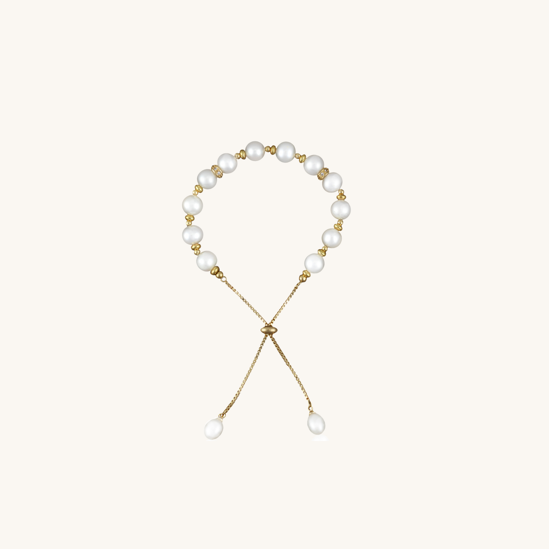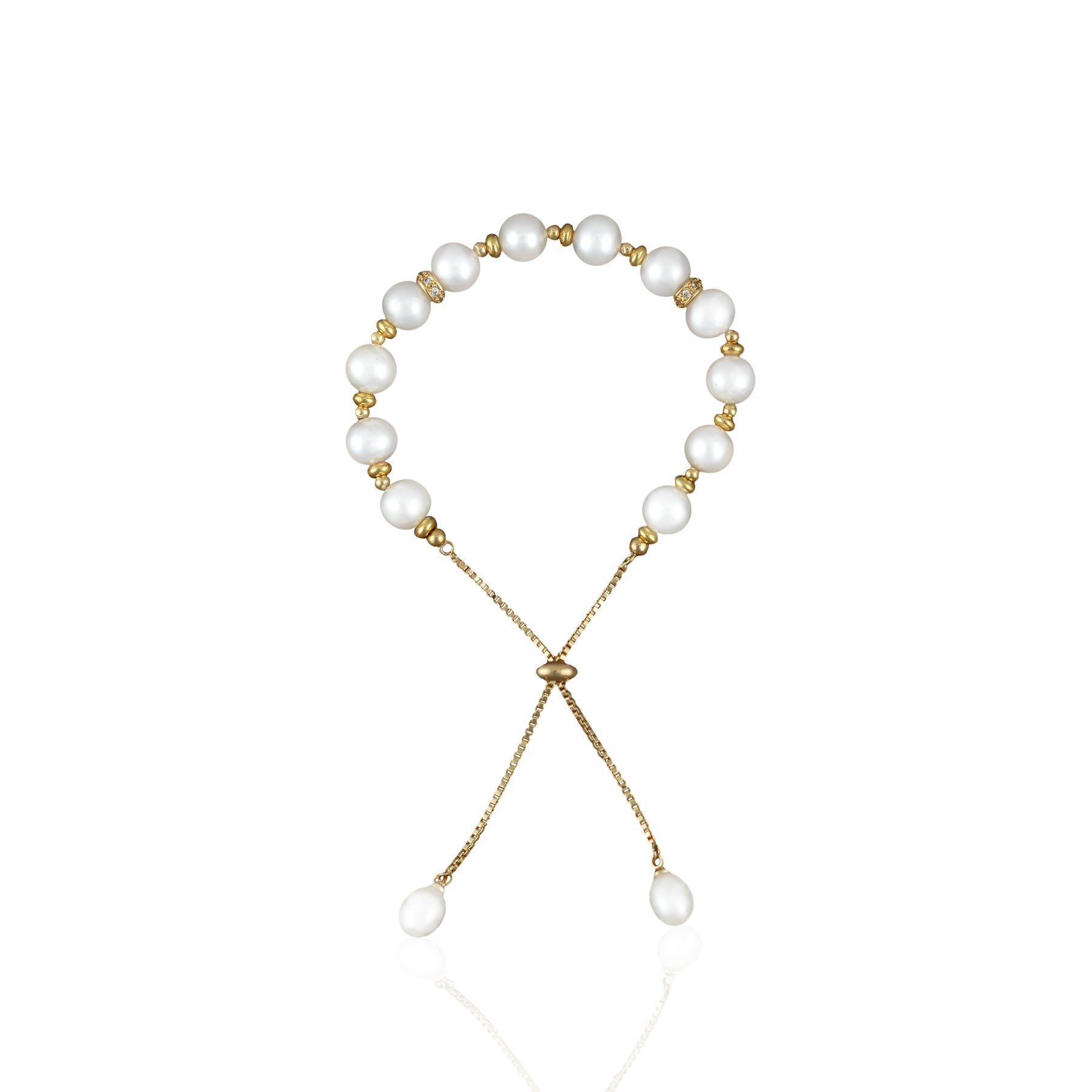 This elegant bracelet boasts 12 freshwater pearls, with an additional pearl fixed to each end. The bracelet's 14K gold-plated chain is fully adjustable and features charming cubic zirconia gemstones. Perfect for a sophisticated and contemporary look.