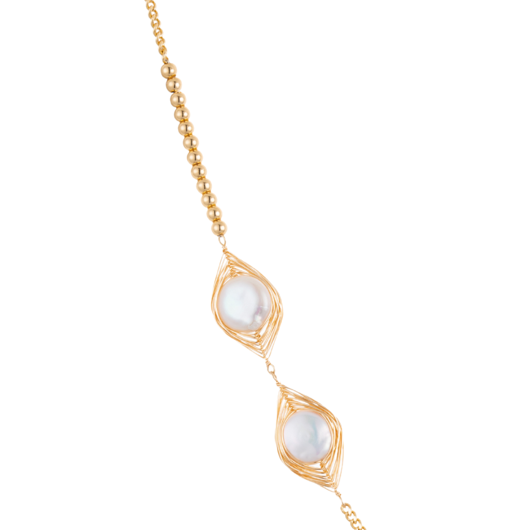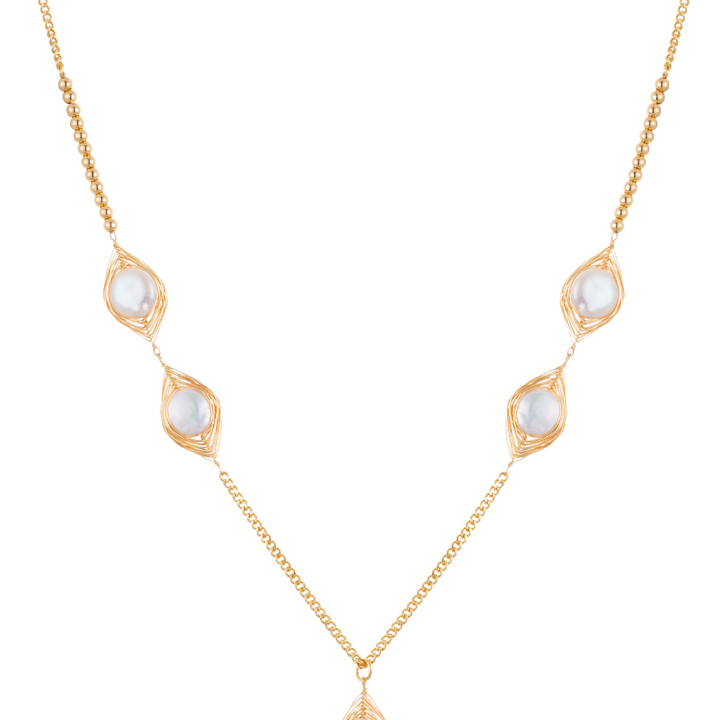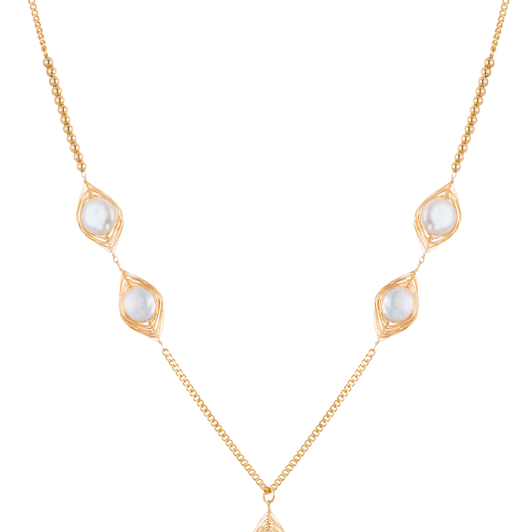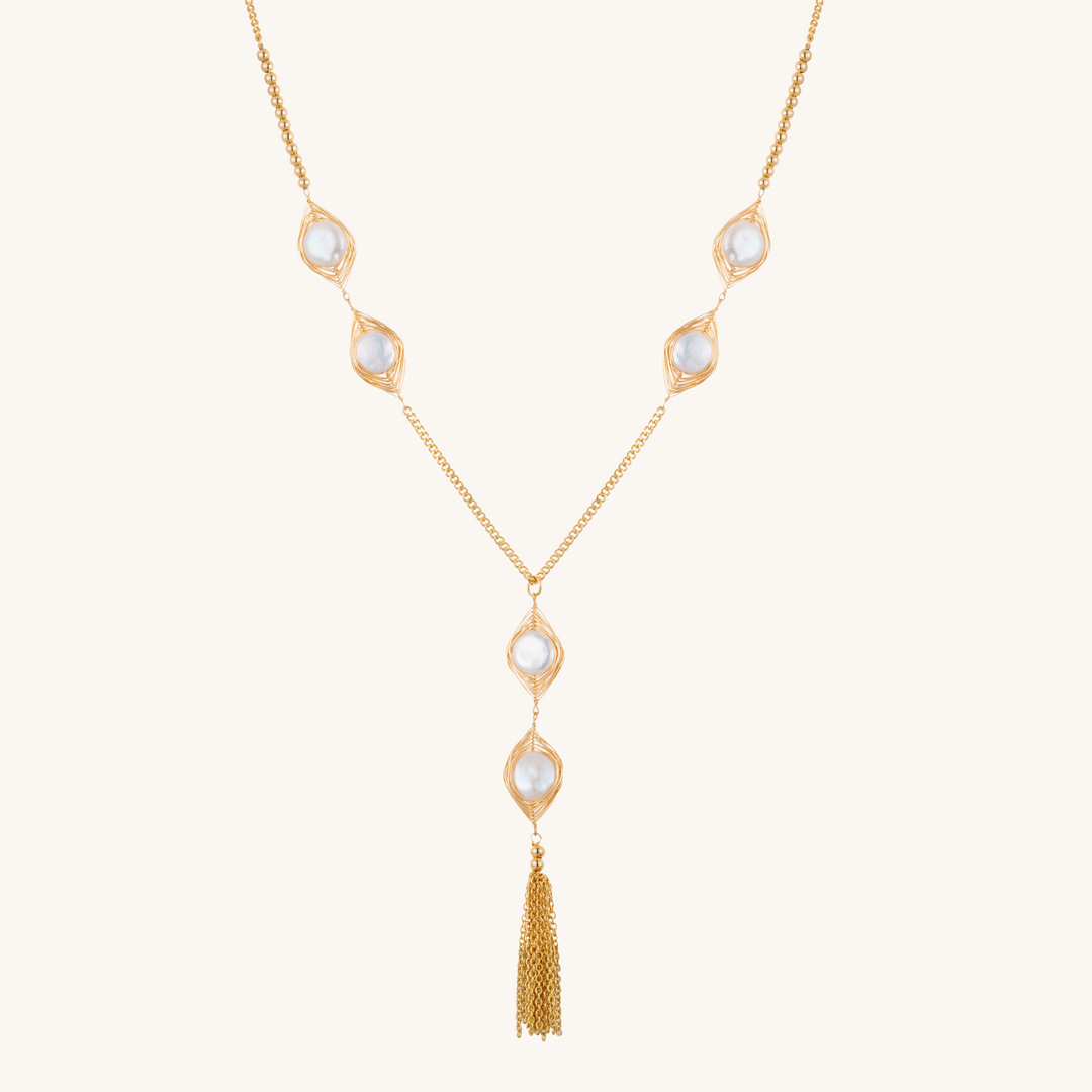 This captivating necklace is handcrafted with delicate 18k gold plated wire and adorned with six unique, irregular-shaped coin baroque pearls. Each pearl is approximately 12-13mm in size, and their organic shapes add a touch of natural elegance to the piece. The 18K gold plated chain and 5cm tassels add a touch of luxury, while the secure lobster clasp ensures effortless wear. Whether you're looking for a statement piece for a special occasion or simply want to add a touch of unconventional flair to your everyday style, this necklace is sure to turn heads and garner compliments.