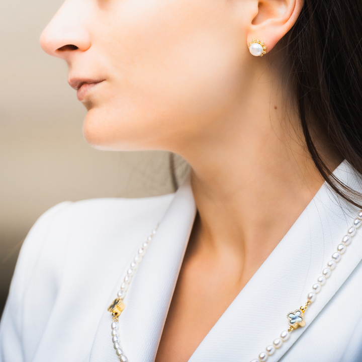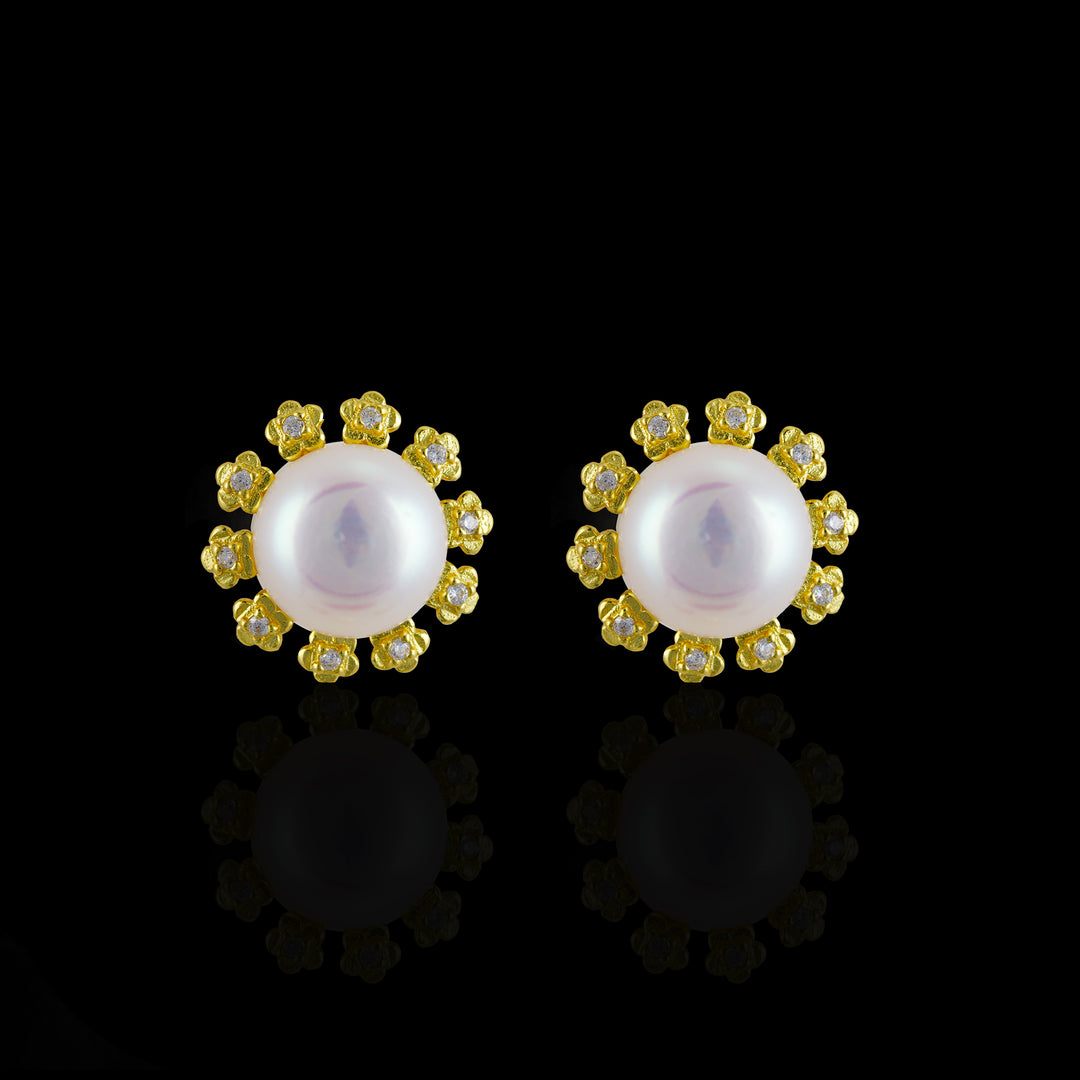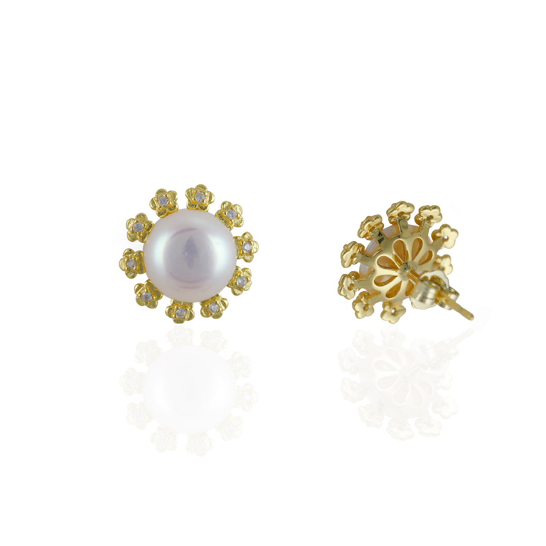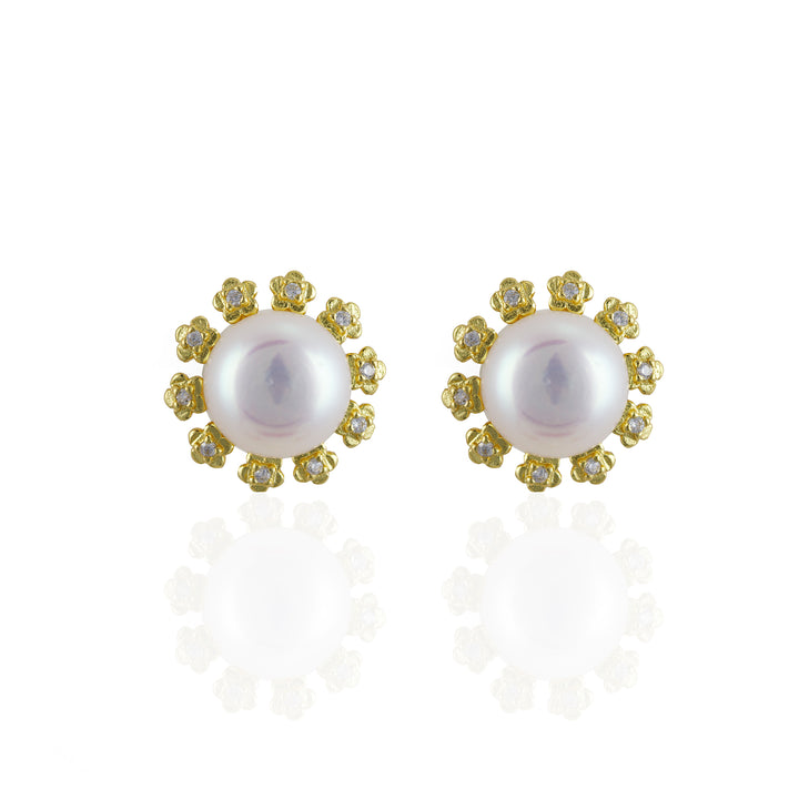 A classic design featuring large freshwater pearls mounted in a lustrous 14K gold finished setting. 10 cubic zirconia gemstones surround each pearl, adding a refractive effect.