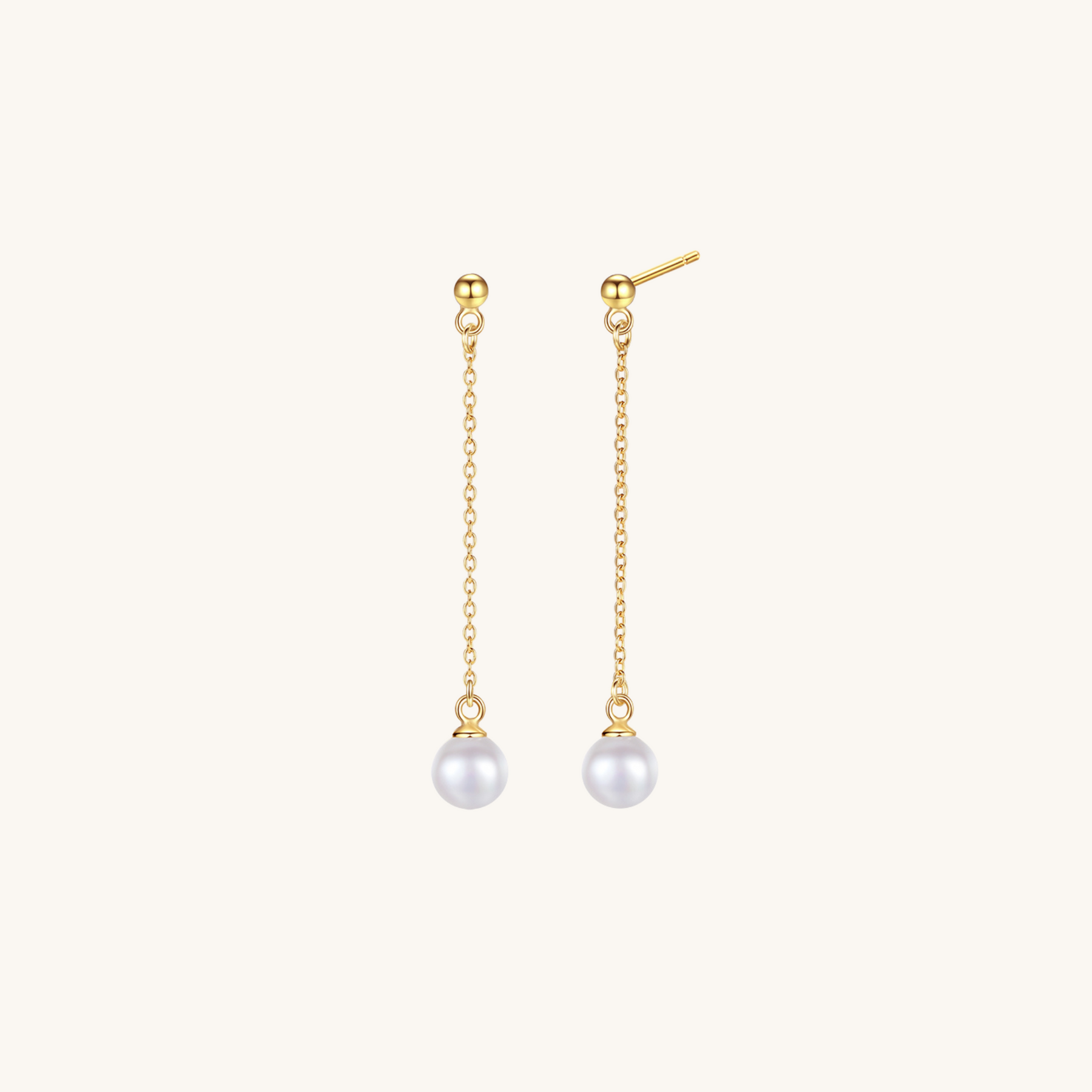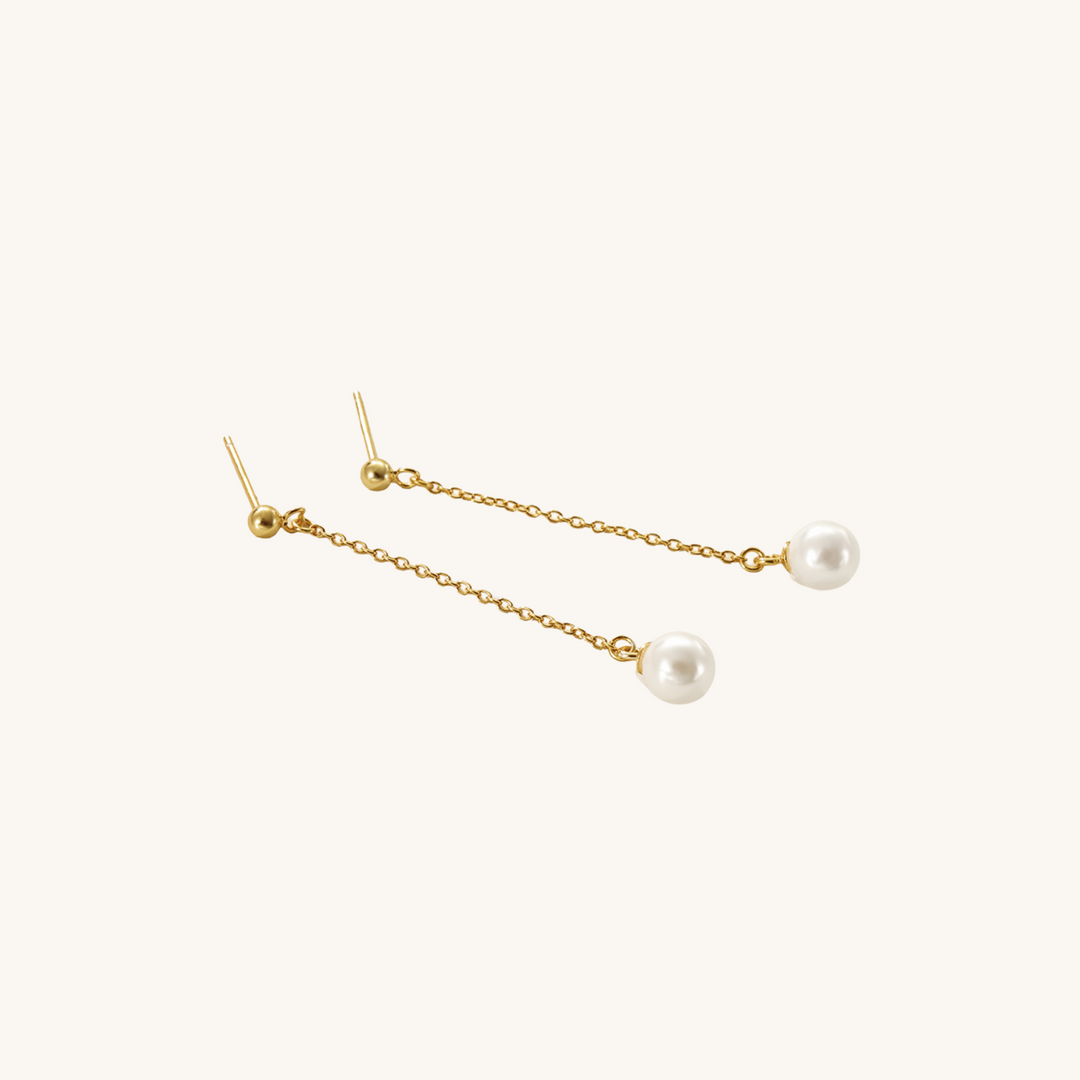 Drop in style with this gorgeous pearl long drop earrings. The freshwater pearl swings from a 6.5cm long 18K gold plated chain with push back hook. These are perfect for contemporary to formalwear outfits.