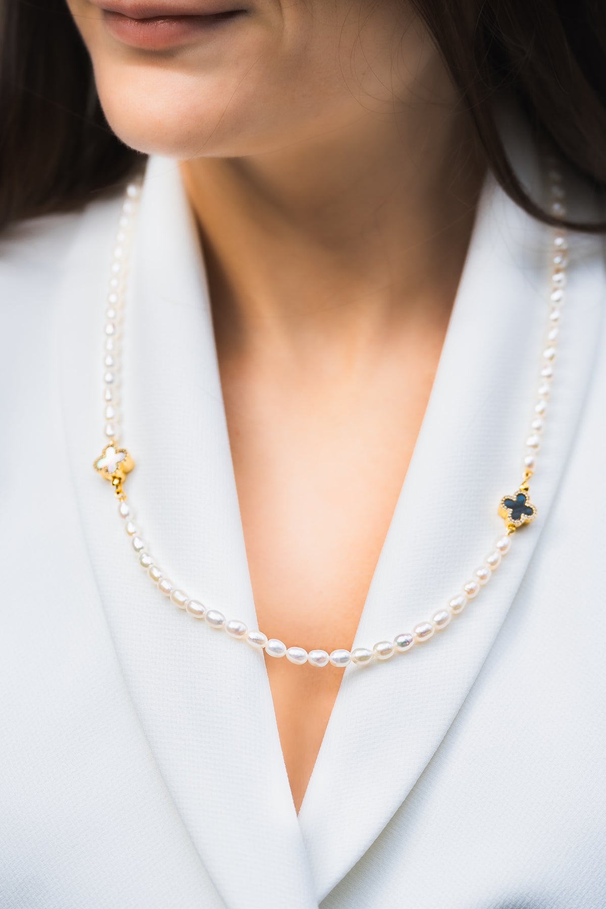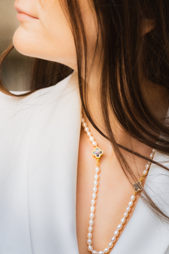 This stunning 2-in-1 set is perfect for any occasion. Wear it as a long necklace or separately as a bracelet and necklace to create a unique look. The finest 6mm rice pearls and mother of pearl clasps are used to create this elegant piece of jewelry.