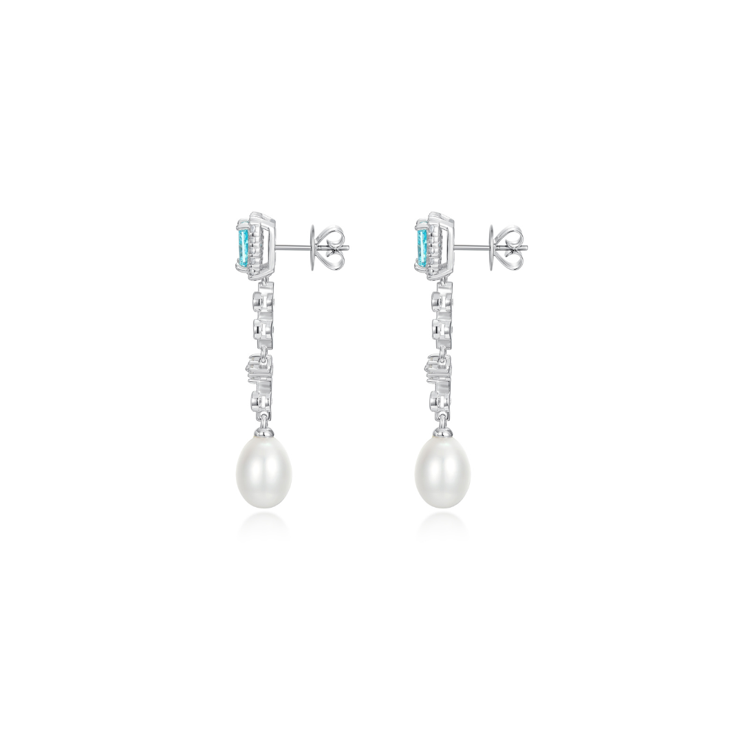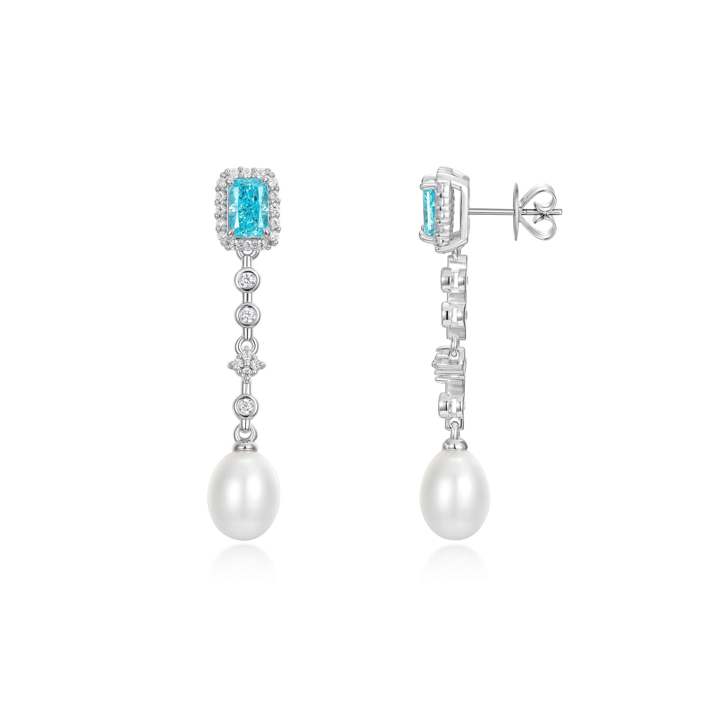 These teardrop pearl earrings, combined with high carbon diamond stones in a sterling silver base with a rhodium plating, offer timeless beauty and superior longevity. The delicate fusion of teardrop pearls and dazzling blue stones creates a stunningly striking visual. These exquisite earrings blend classic sophistication and contemporary flair, elevating your look with every wear.