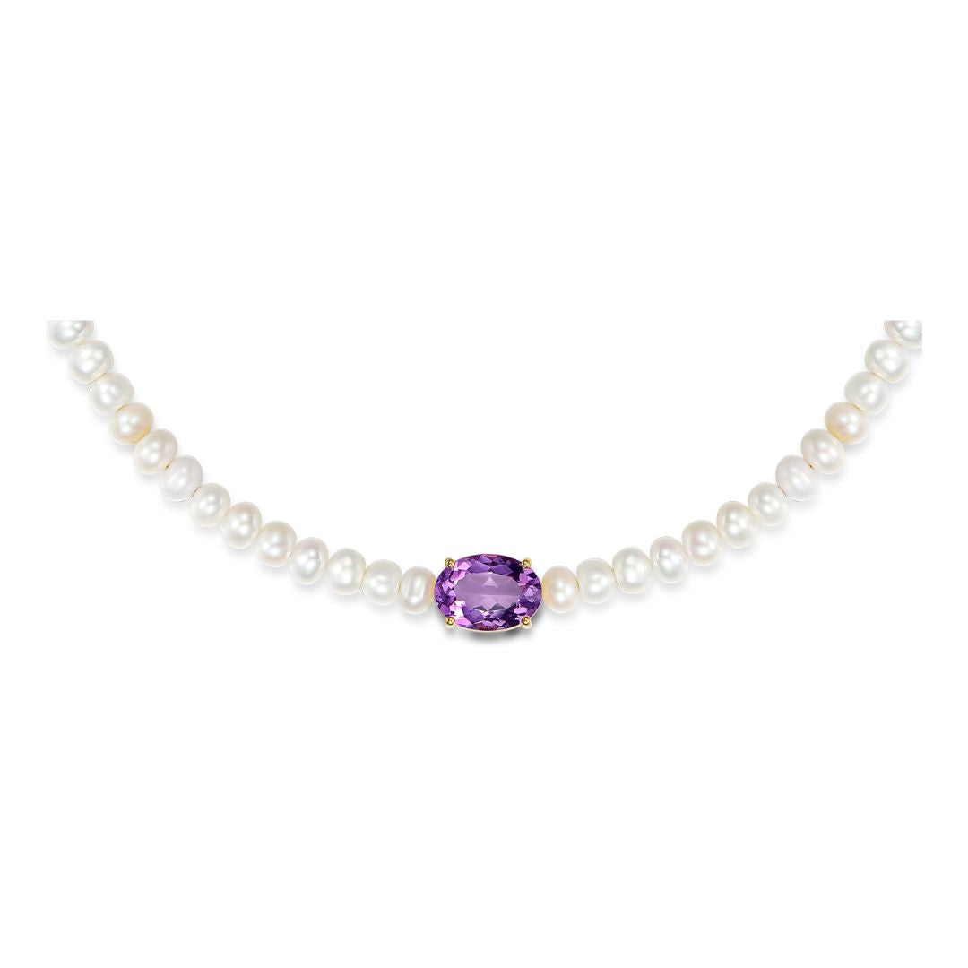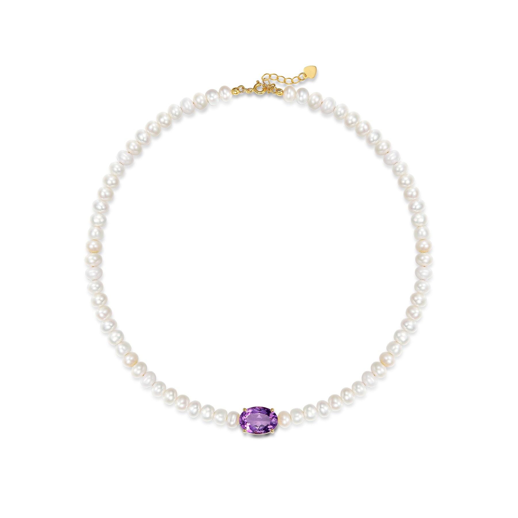 This exquisite necklace harmoniously merges the enduring grace of cultured pearls with the enchanting magnetism of amethyst gemstones. Impeccably threaded along the collar, the radiant pearls establish an opulent and refined aesthetic. Meanwhile, the resplendent purple tones of the amethysts infuse a regal allure into the necklace, rendering it an ideal adornment for every occasion. Elevate your style effortlessly with this exceptional piece.