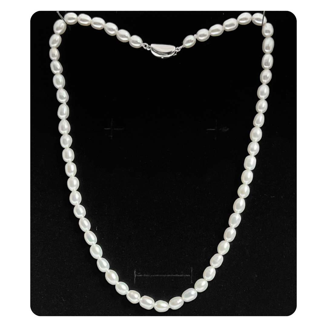 This gorgeous single strand high luster 5-6mm freshwater rice pearl necklace is perfect for anyone who likes to wear as a choker necklace style. The pearl necklace length is 15" (38 cm) and comes with sterling silver clasp. This necklace add a touch of elegance to any outfit.